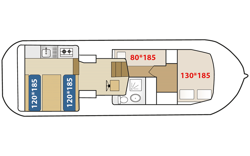 Cabine avant : 1 lit double, penderie et rangements. Une couchette simple dans le couloir.