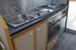- Une cuisine équipée avec plaques de cuisson, four, évier, réfrigérateur