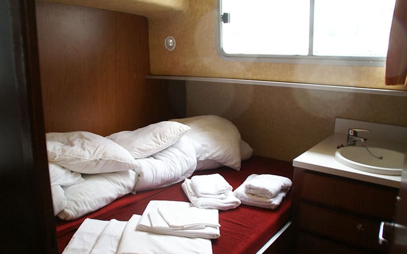 2 Bugkabinen mit je 1 Doppelbett und einem darüberliegenden Einzelbett